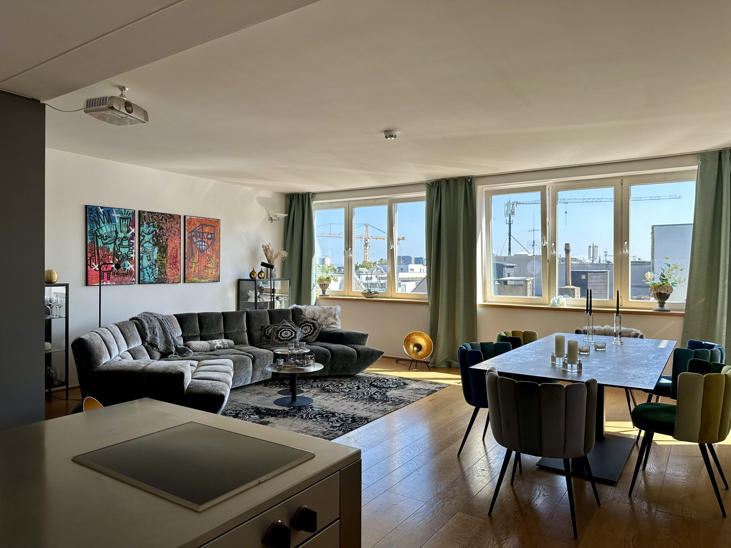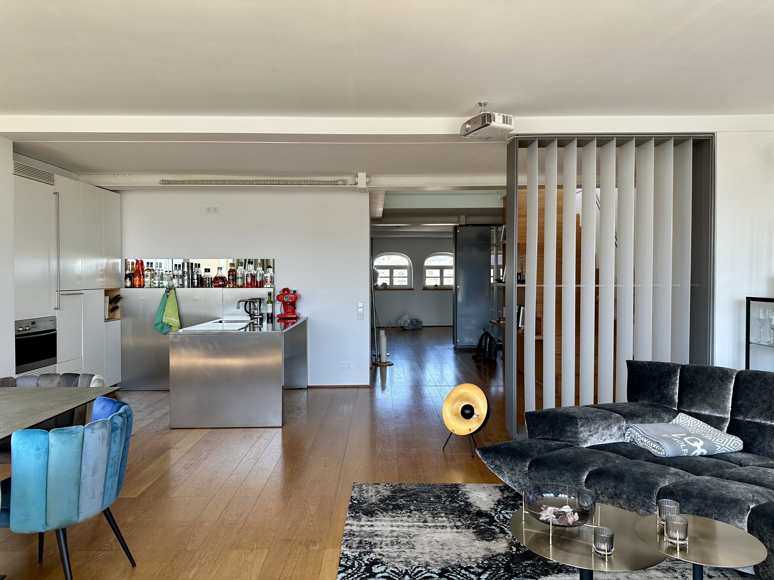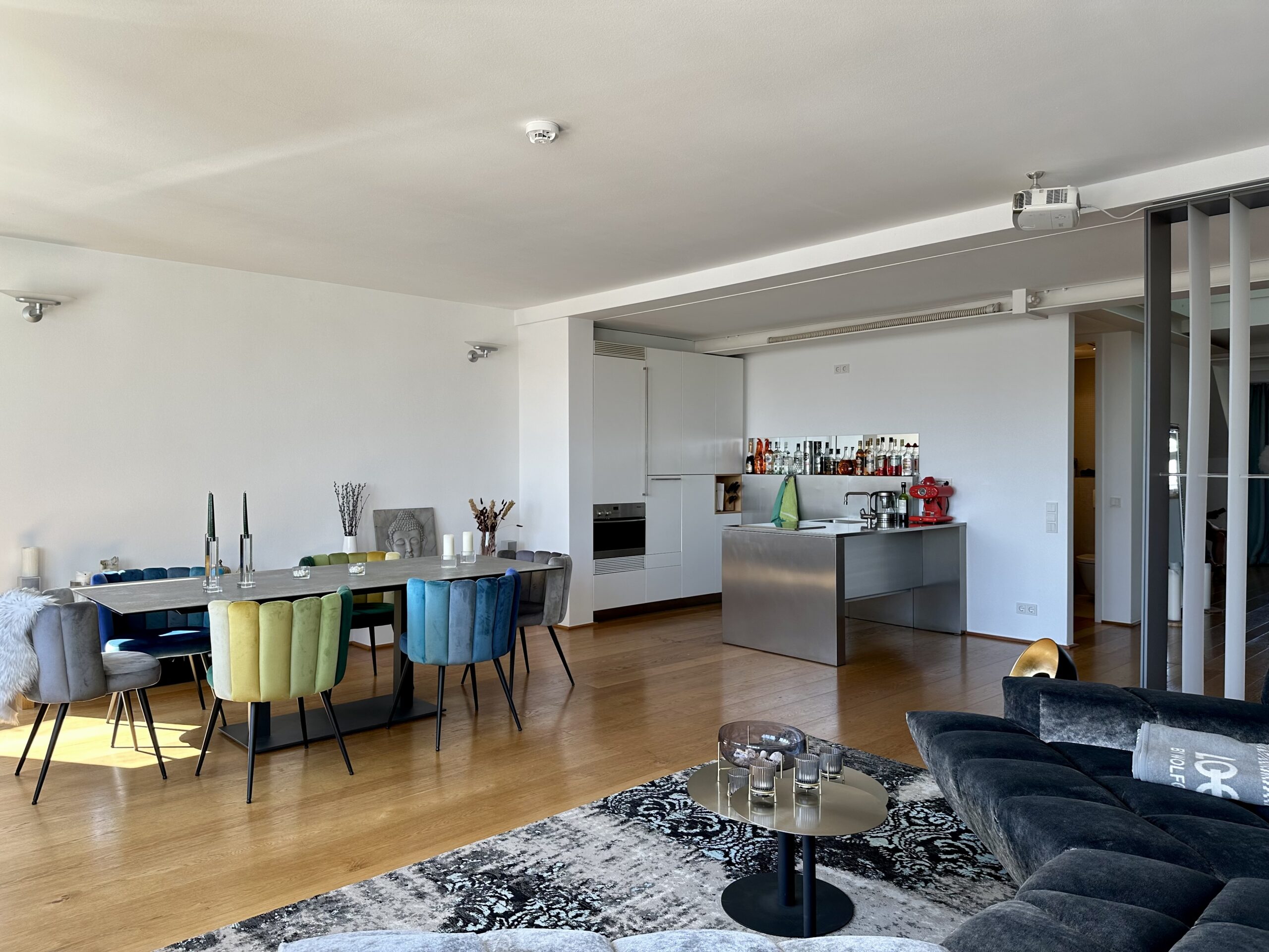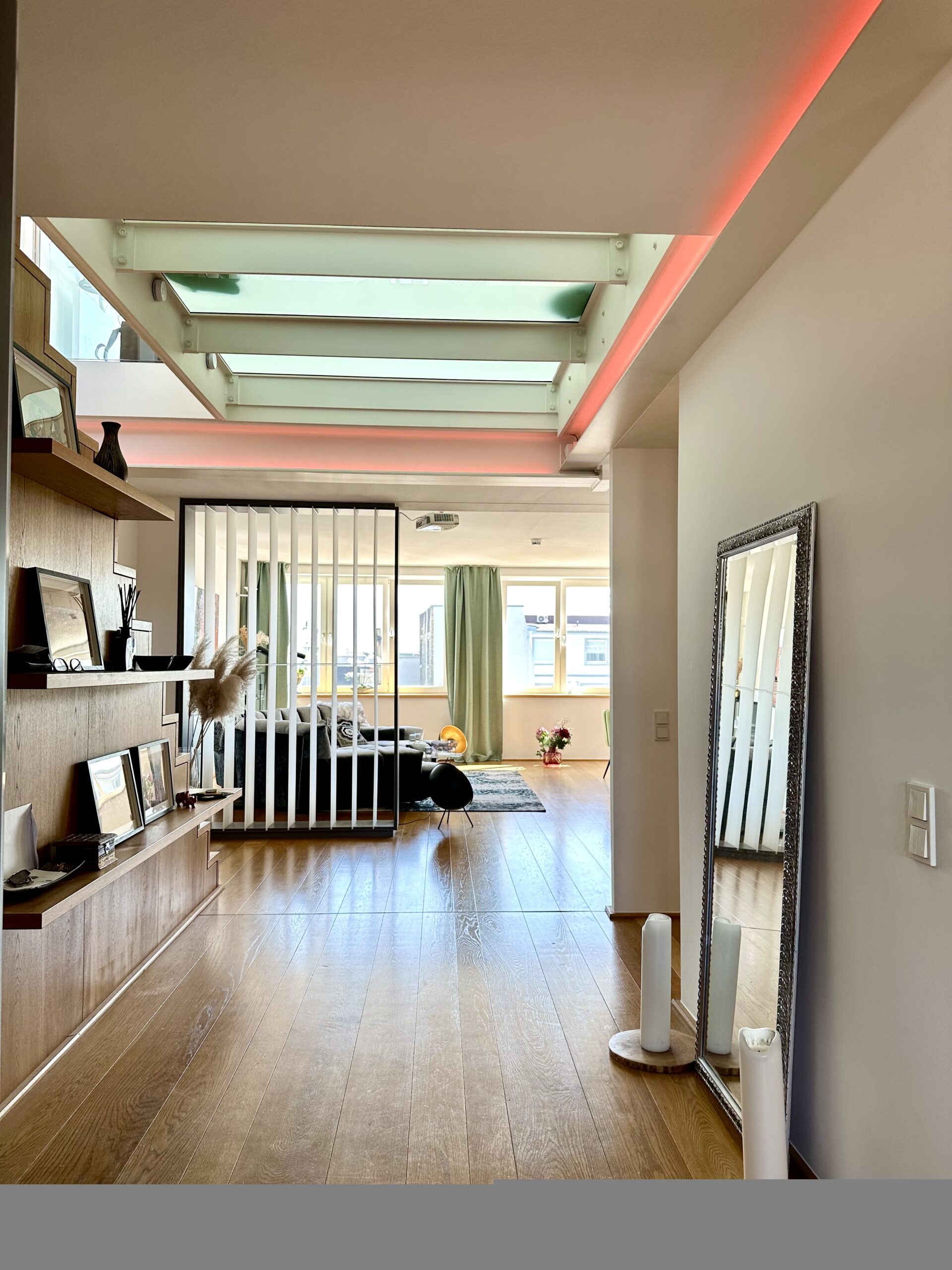 Die Wohnung liegt in der 5. Etage und ist komfortabel über einen Aufzug erreichbar. Besonders hervorzuheben ist die exklusive Penthouse-Steuerung des Aufzugs, die eine gezielte Anfahrt der Etage ermöglicht und zusätzlichen Komfort sowie ein erhöhtes Maß an Privatsphäre bietet. Bereits beim Betreten wird das konsequent offene Raumkonzept deutlich: Auf eine klassische Eingangsdiele wurde bewusst verzichtet, um ein Maximum an Großzügigkeit und Loft-Atmosphäre zu schaffen.