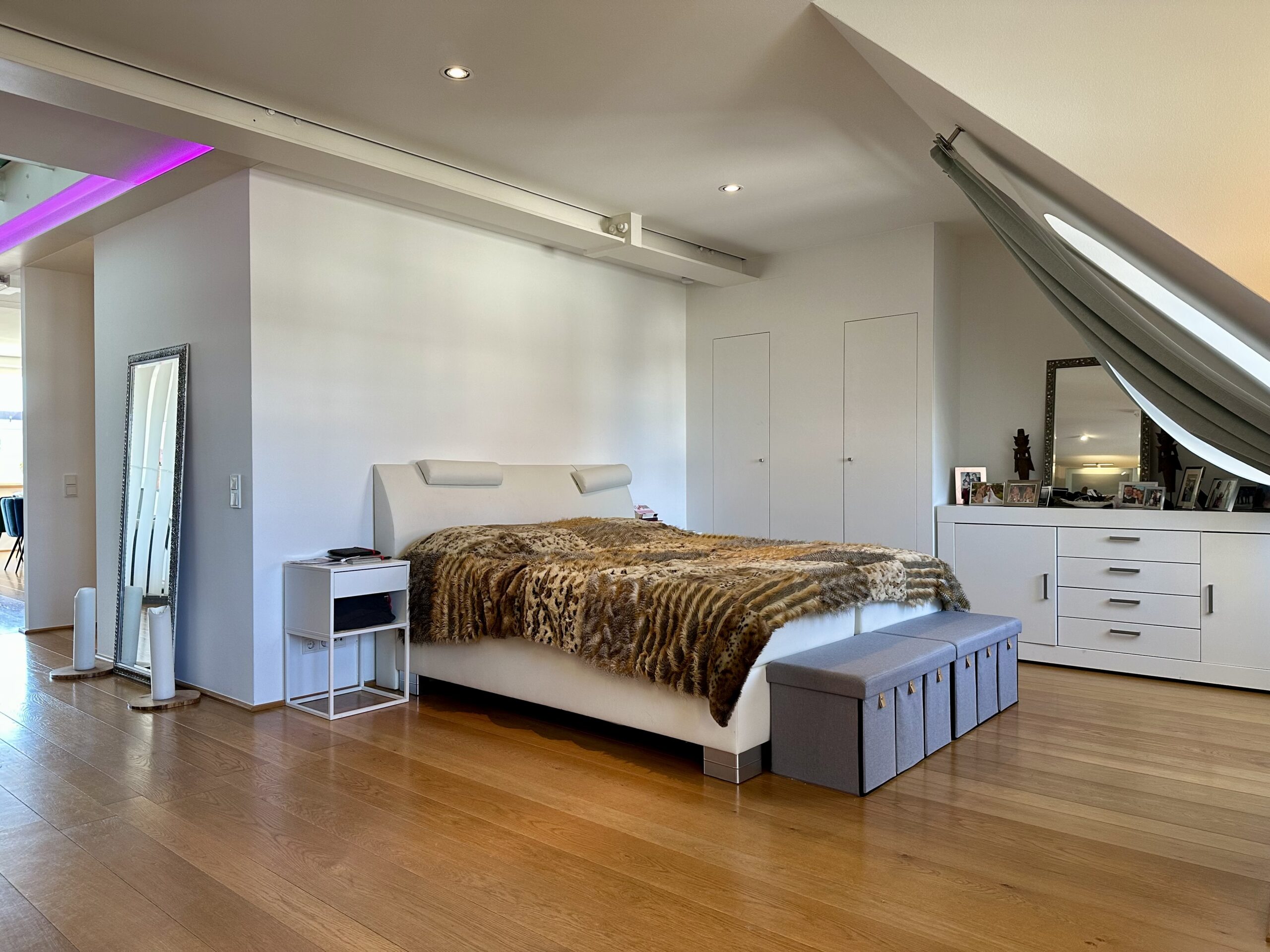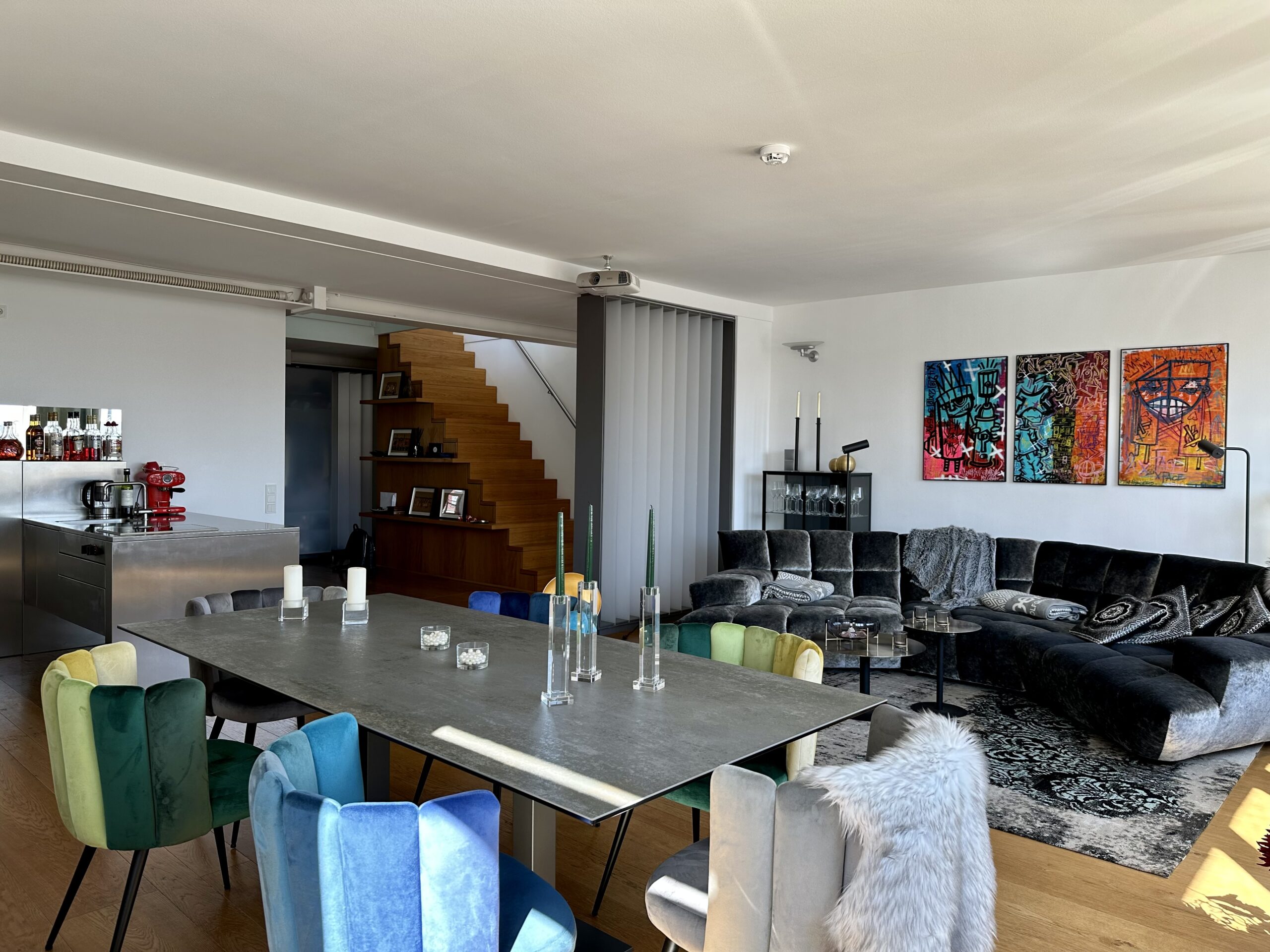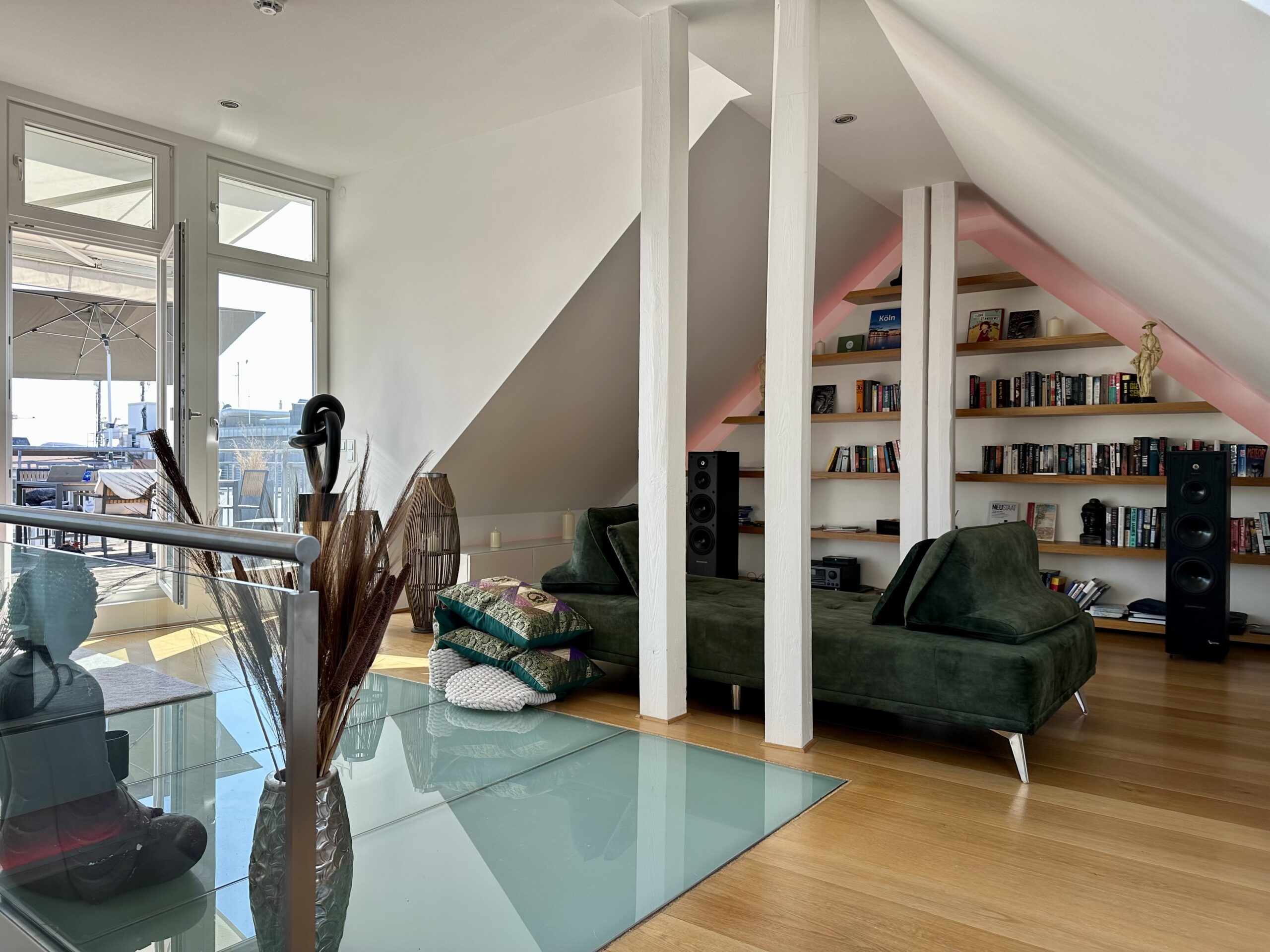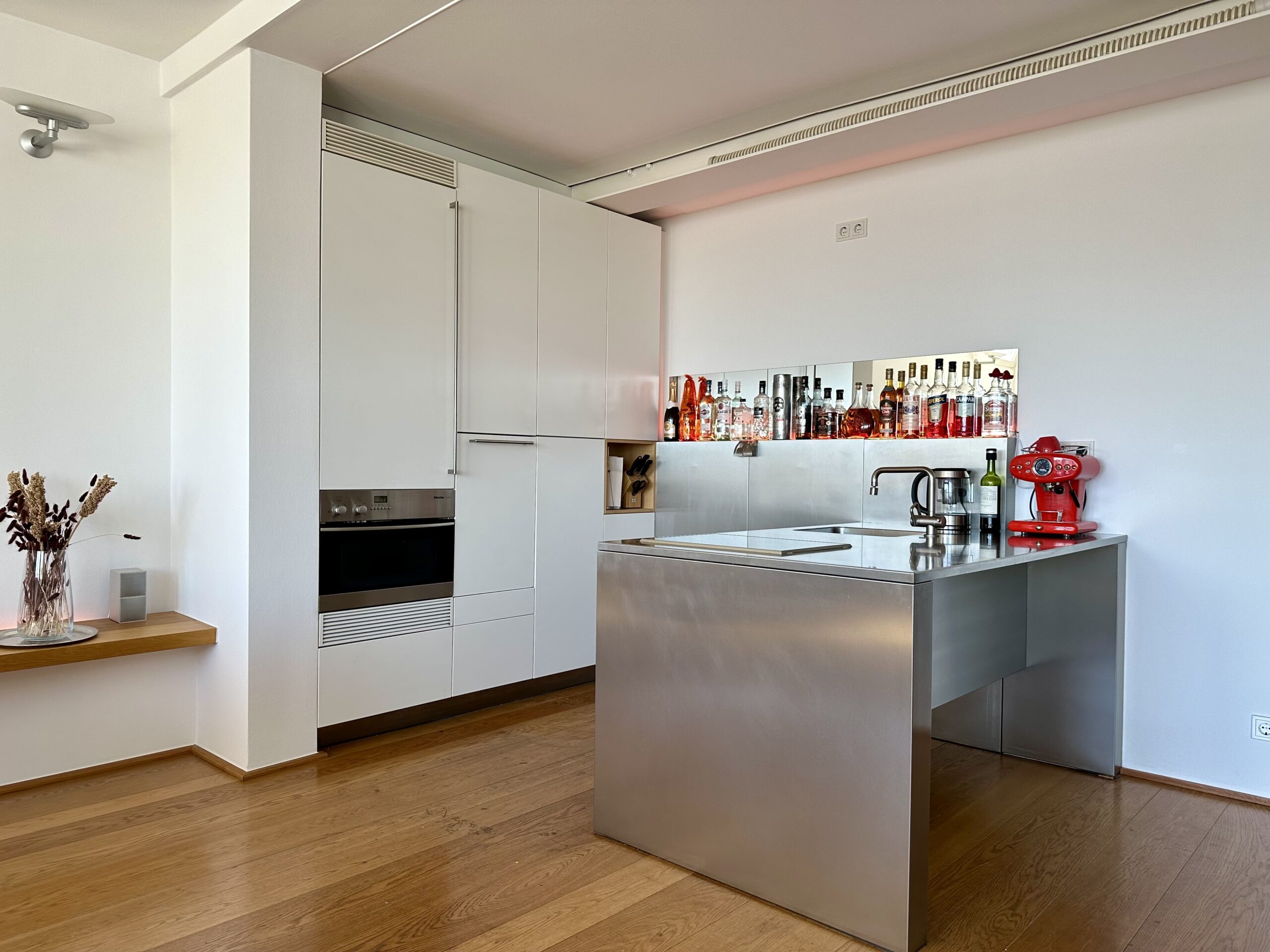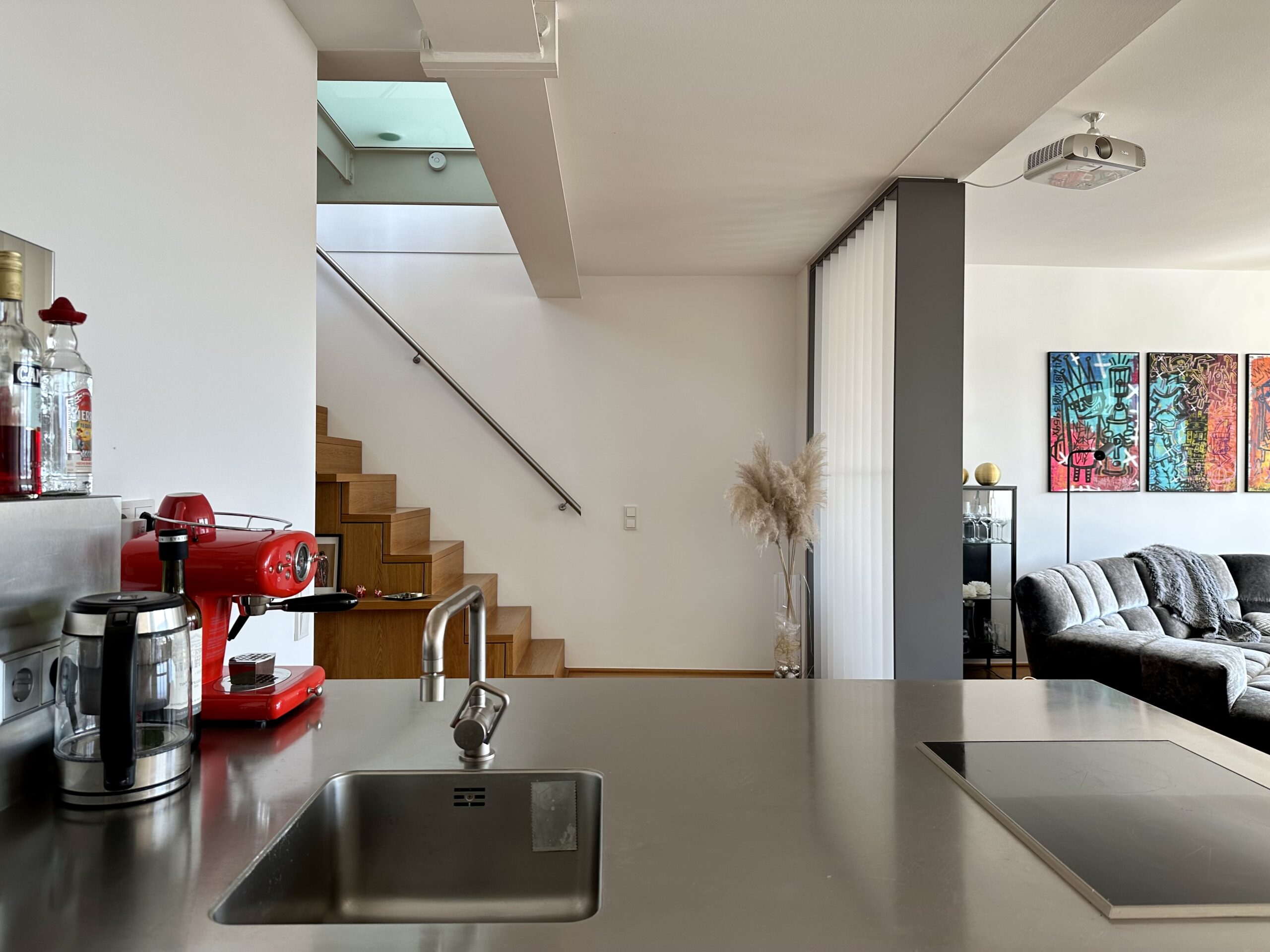 Die erste Ebene überzeugt mit einem weitläufigen Wohnbereich, der fließend in die offene, hochwertige Einbauküche übergeht. Ausgestattet mit Geräten von Miele und Gaggenau fügt sich diese elegant und nahezu nahtlos in den Raum ein. Dezente Raumteiler strukturieren die Bereiche Wohnen, Essen sowie Schlafen und Arbeiten, ohne die Offenheit einzuschränken. Ergänzt wird diese Ebene durch ein stilvolles Badezimmer mit großzügiger, bodentiefer Dusche inklusive Raindance-Duschbrause sowie einem Doppelwaschtisch. Das separate WC ist hochwertig ausgeführt und unterstreicht den komfortablen Anspruch der Wohnung.