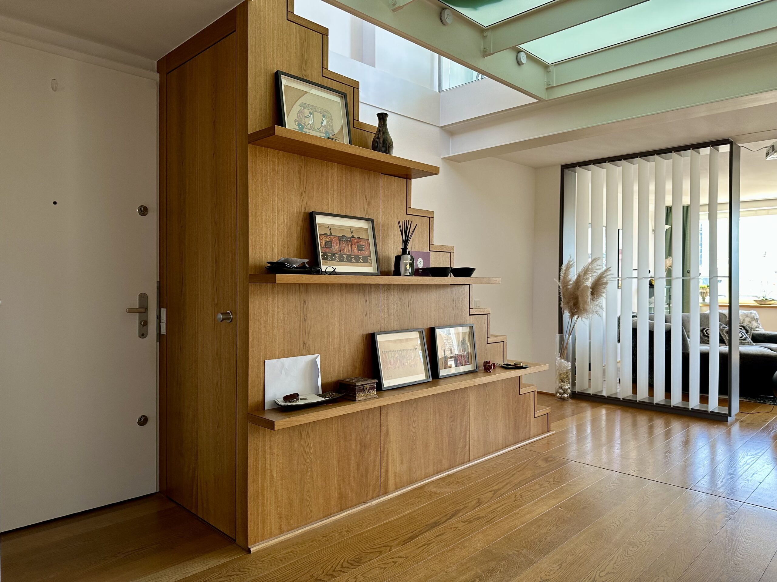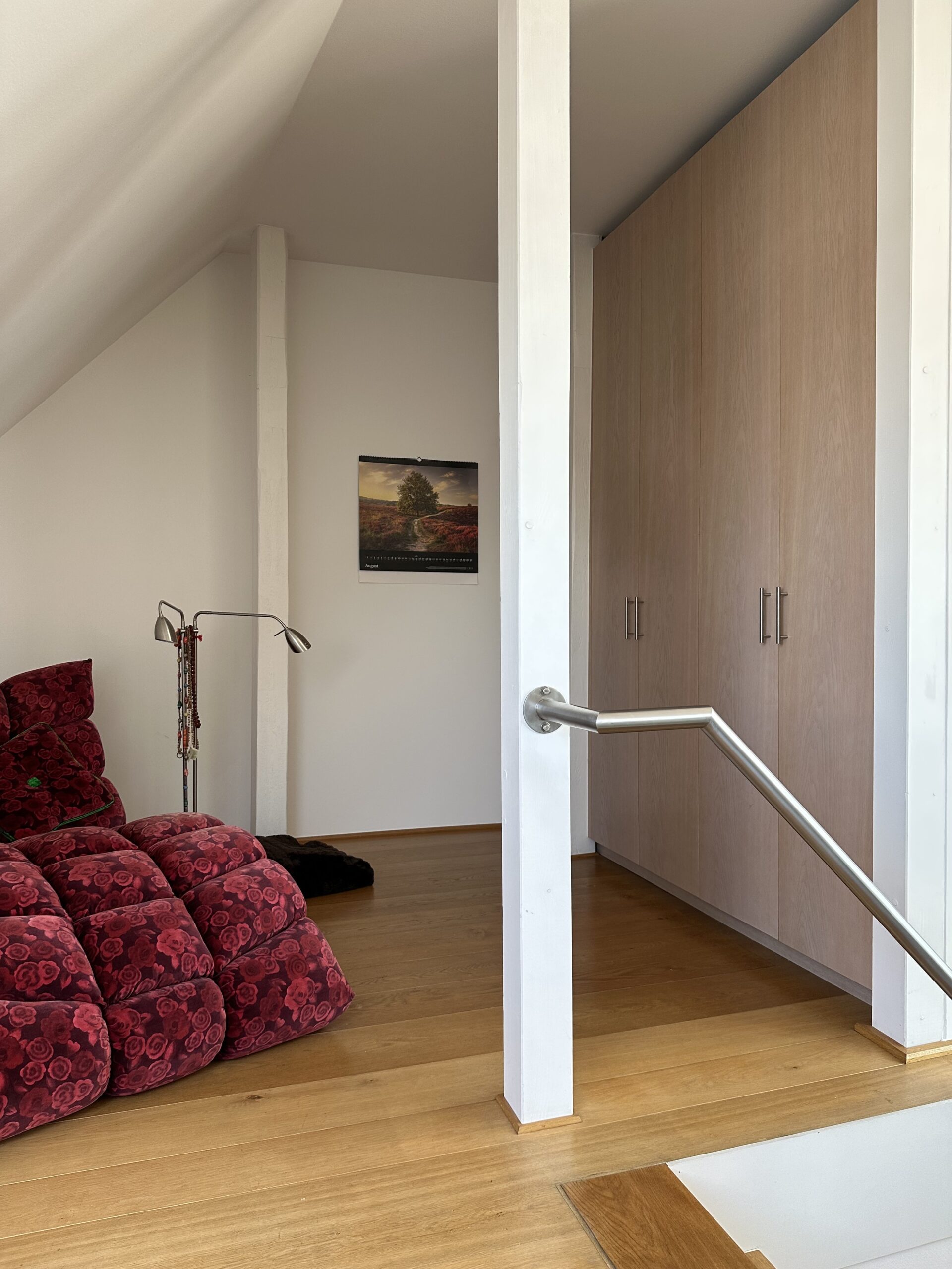 Über eine offene Treppe gelangen Sie auf die Galerie- bzw. Studioebene, die sich flexibel als Wohn-, Schlaf- oder Arbeitsbereich nutzen lässt. Ein maßgefertigter Einbauschrank bietet praktischen Stauraum und fügt sich harmonisch in das Raumkonzept ein.