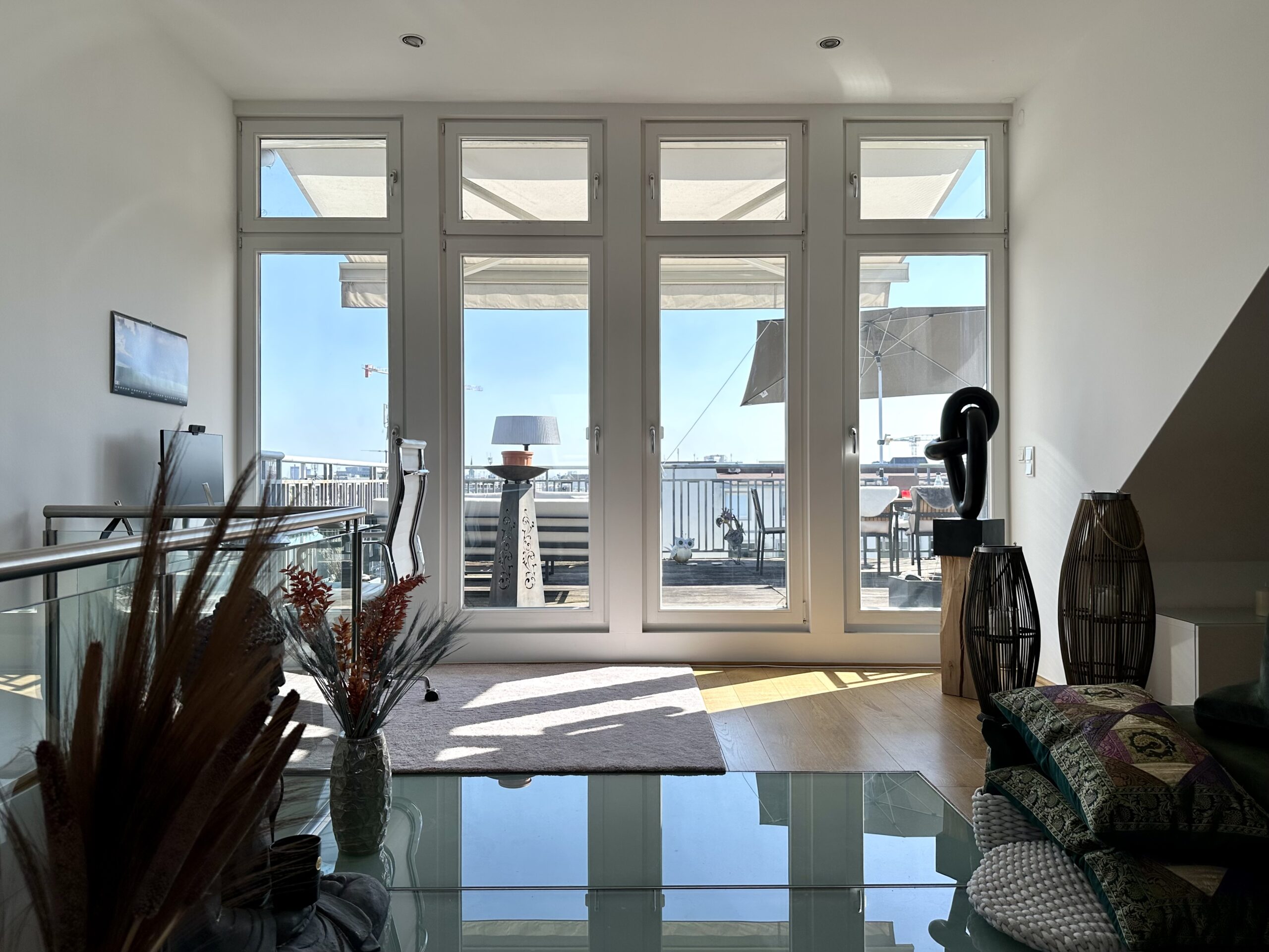 Von hier aus eröffnet sich der Zugang zur außergewöhnlichen Dachterrasse: Mit einer Fläche von ca. 45 m² und südlicher Ausrichtung bietet sie ein unvergleichliches Panorama – vom Kölner Dom bis hin über den Rheinauhafen und weiter bis in das Siebengebirge. Diese einzigartige Aussicht über die Dächer der Domstadt schafft ein exklusives Freiluftambiente und lädt zu jeder Tageszeit zum Verweilen ein.
