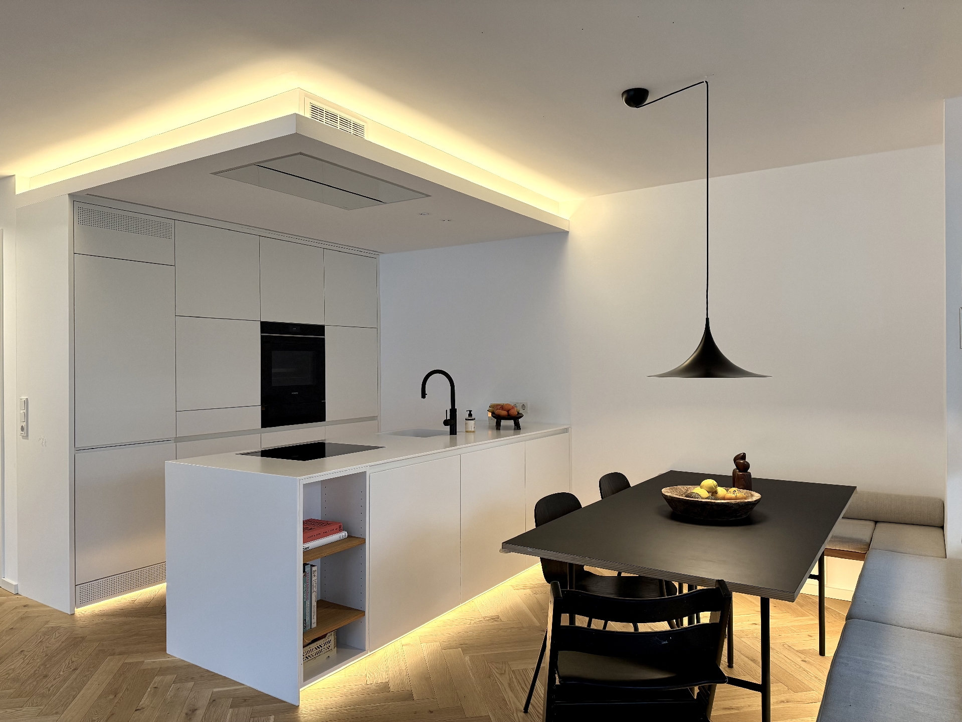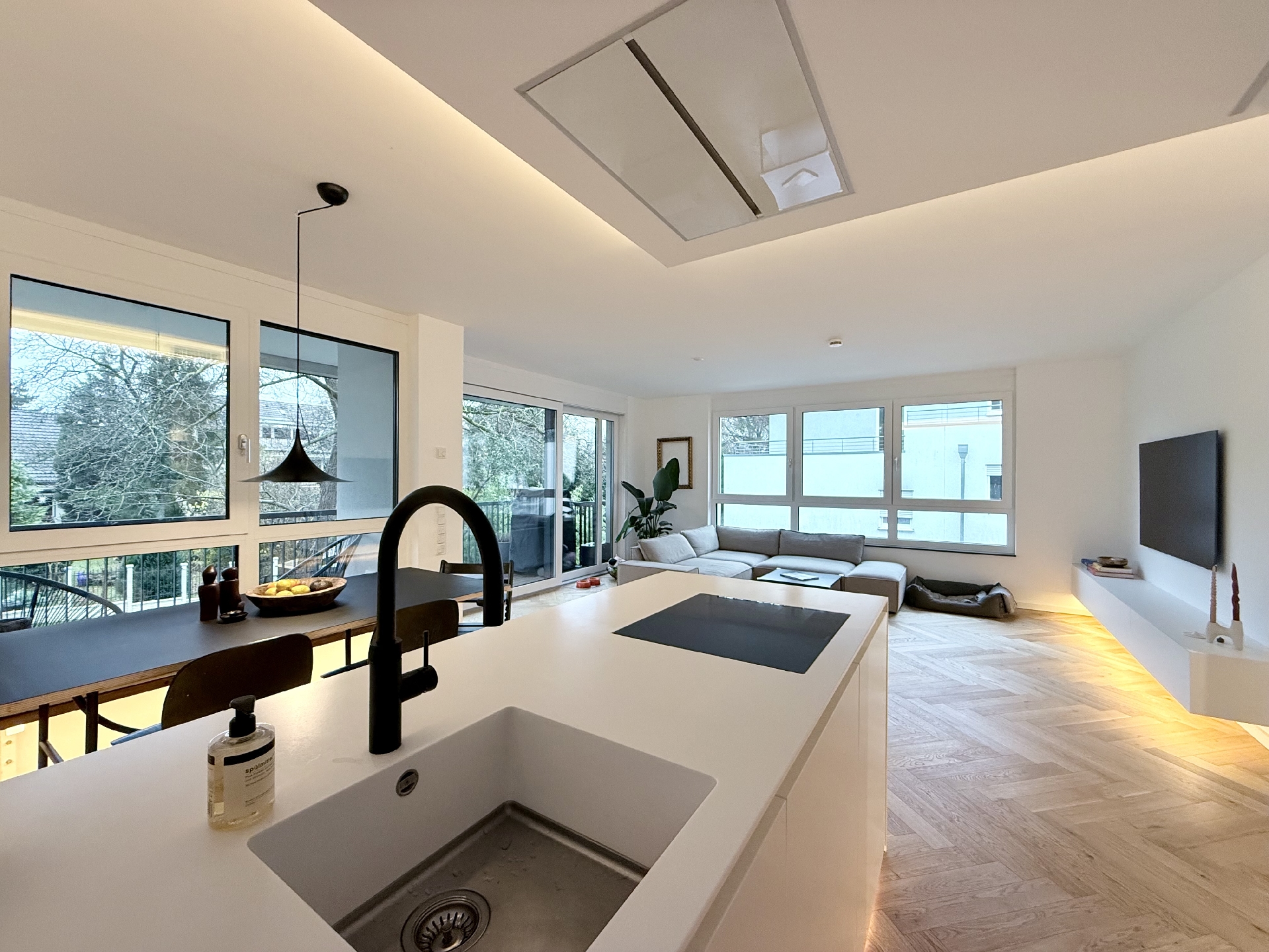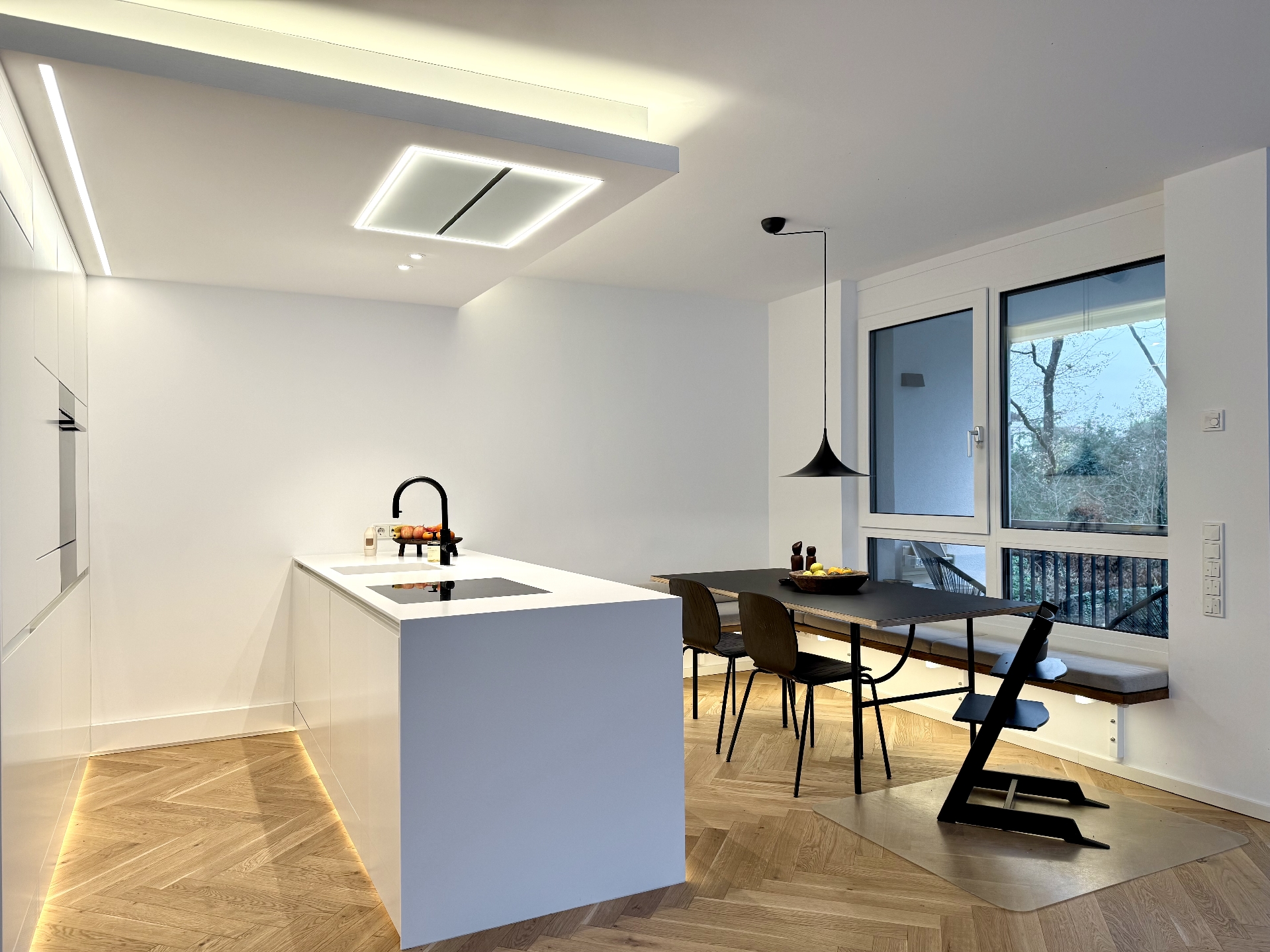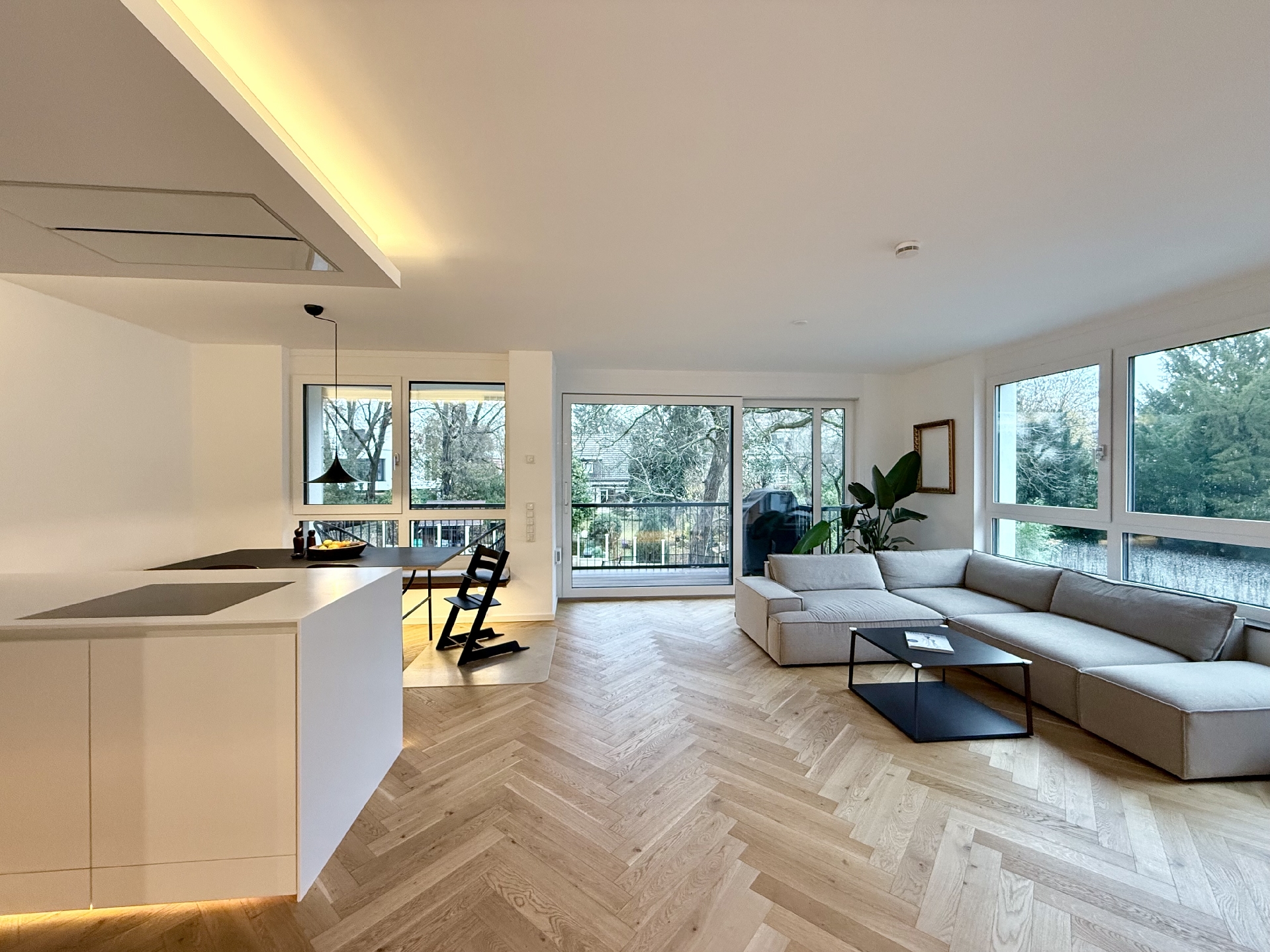 Die Diele führt direkt in den großzügigen, lichtdurchfluteten Wohn- und Essbereich mit offener Küche. Der durchdachte Zuschnitt ermöglicht eine flexible Möblierung. Die hochwertige Einbauküche ist Bestandteil der Mietsache und fügt sich harmonisch in den offenen Grundriss ein – ideal für gesellige Abende und gemeinsames Kochen.