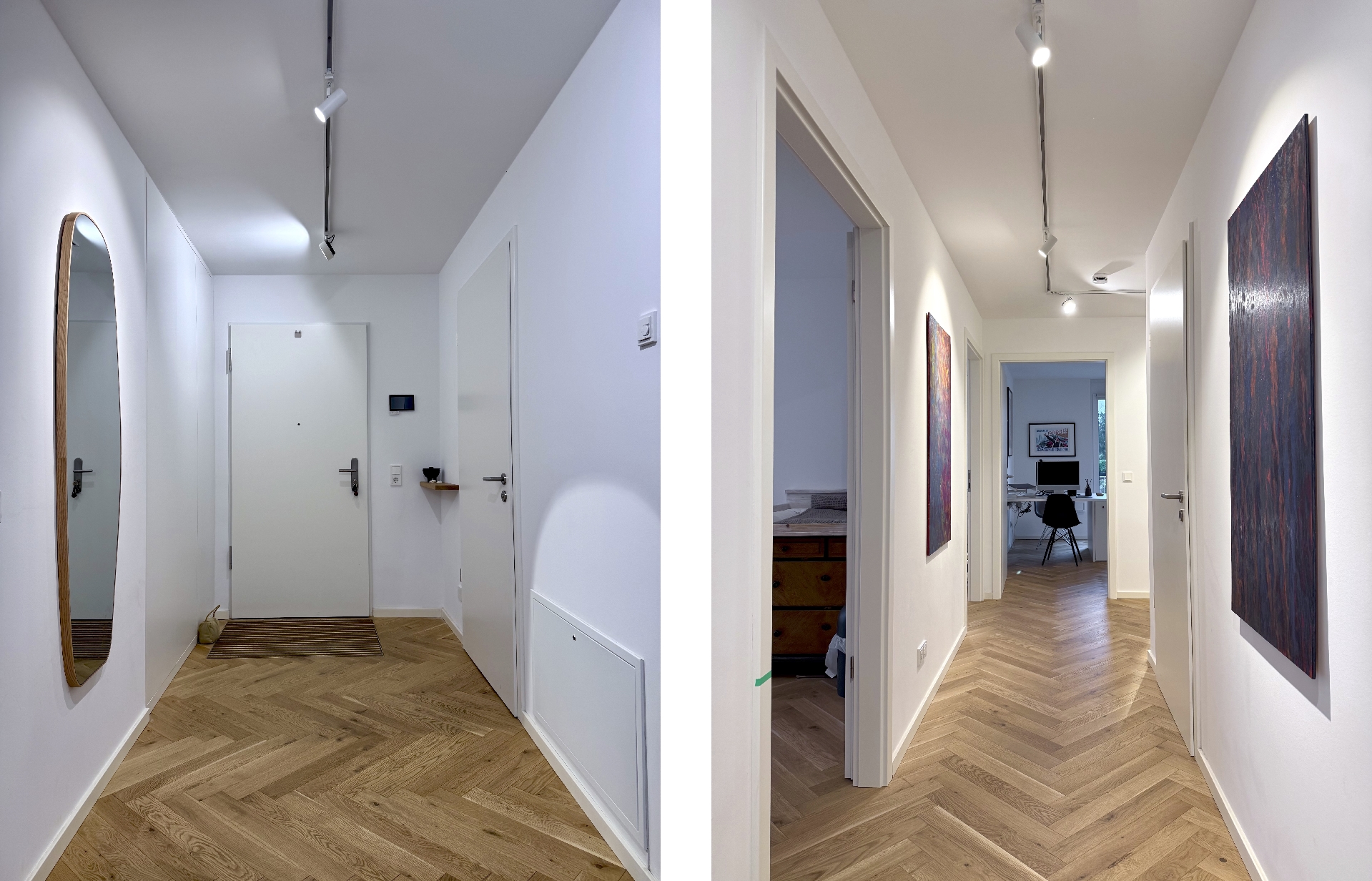 Über die einladende Eingangsdiele sind sämtliche Räume der Wohnung zentral erreichbar. Ein platzsparender, hochwertiger Einbauschrank dient als Garderobe. Besonders praktisch ist der bodenbündig eingelassene Sauberläufer, der für Ordnung und Komfort sorgt.