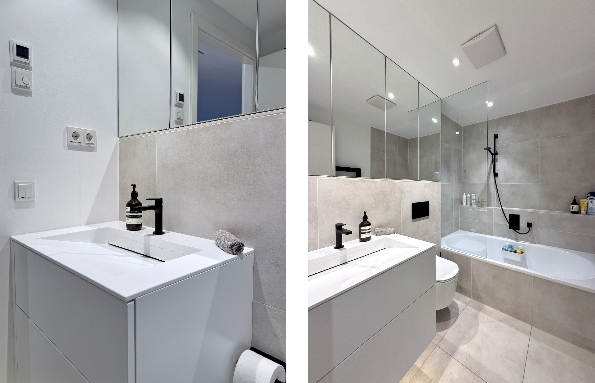 Hochwertige Sanitärausstattung mit exklusiven dunklen Armaturen und zusätzlichen Ausstattungsdetails wie Design-Handtuchheizkörper, Spiegelschränken sowie eleganten Waschtischunterschränken in beiden Bädern