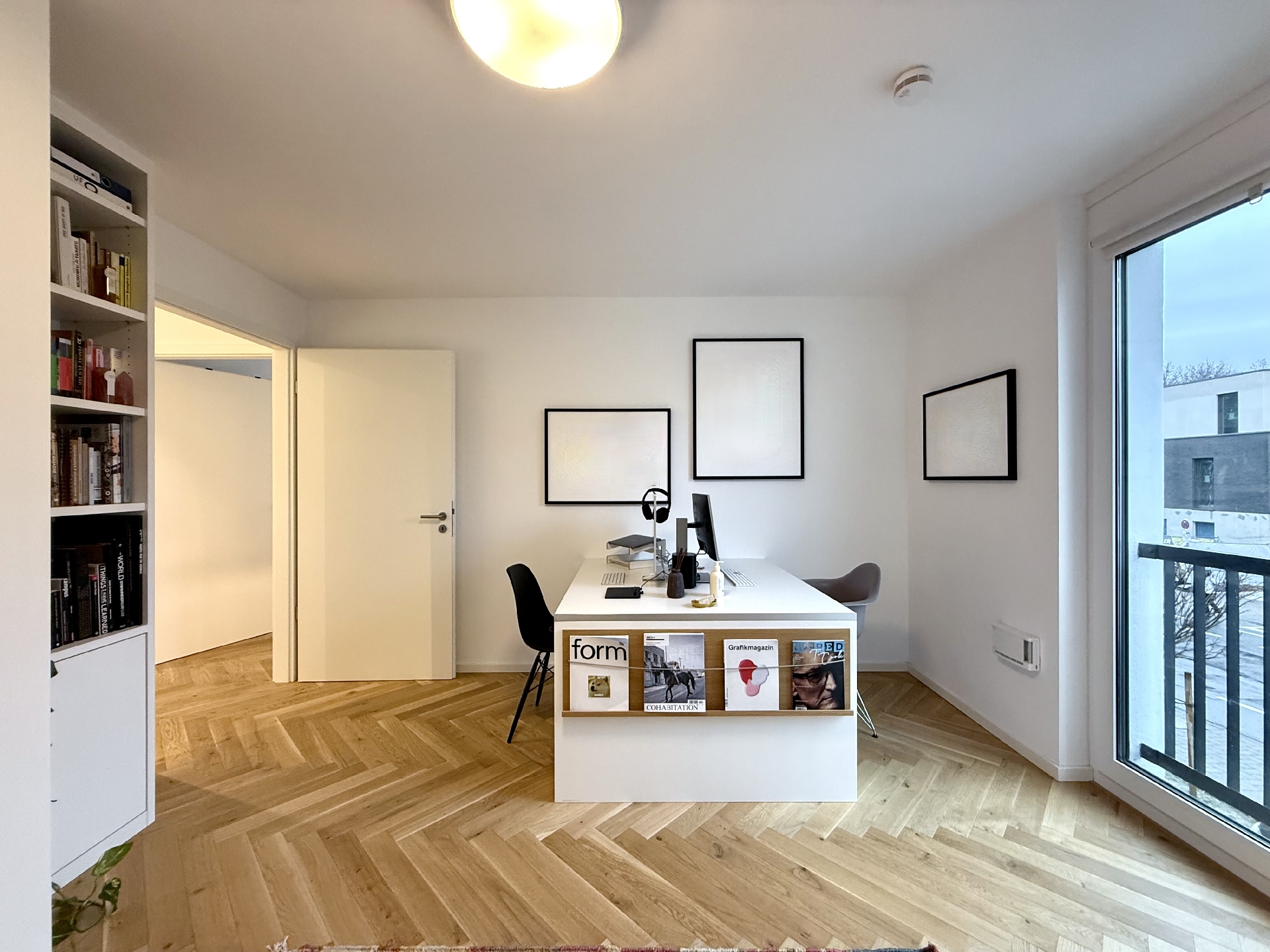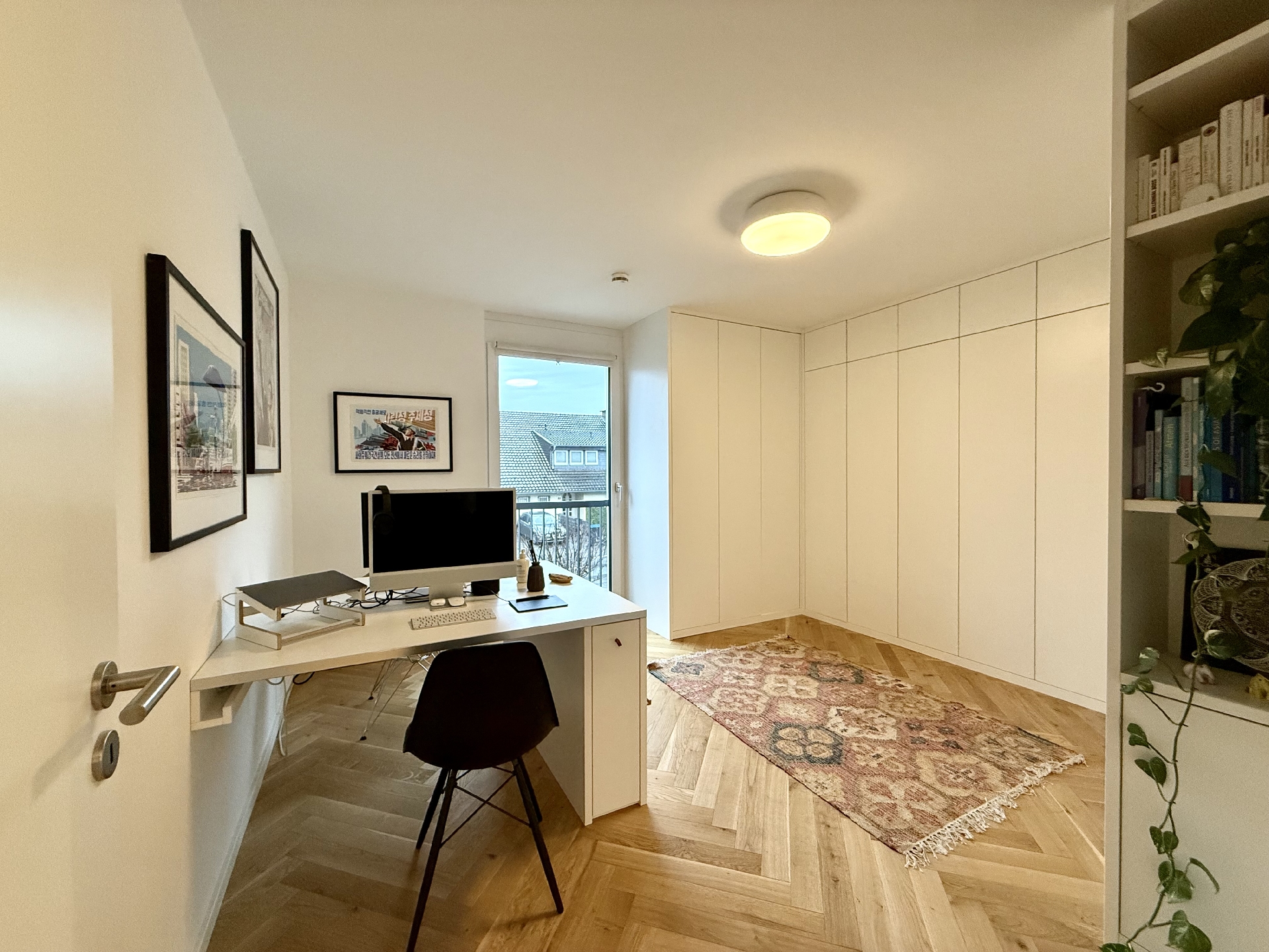 Die beiden Schlafzimmer sind großzügig geschnitten und ermöglichen eine flexible Nutzung und Möblierung. Das dritte Zimmer ist dank der vorhandenen exklusiven, maßgefertigten Einbauten ideal als Home-Office und Gästezimmer nutzbar.