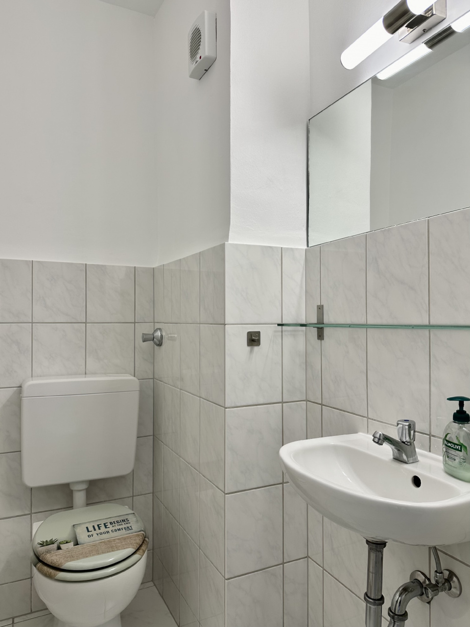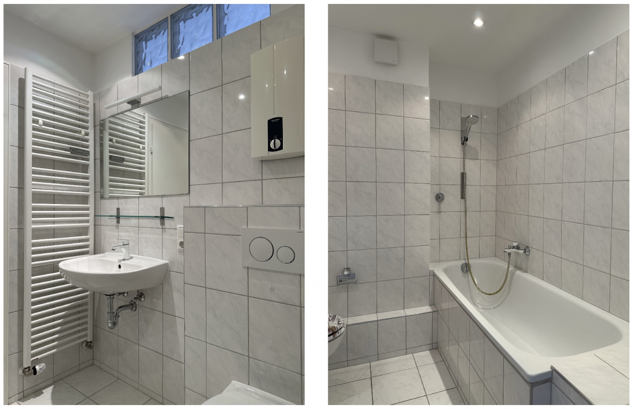Das Badezimmer verfügt über eine Badewanne und bietet eine zeitlose Ausstattung. Die Beleuchtung erfolgt über Downlights und zudem ist ein Handtuchheizkörper installiert. Ein weiteres Gäste-WC ist ebenfalls vorhanden und über die Diele zu erreichen.