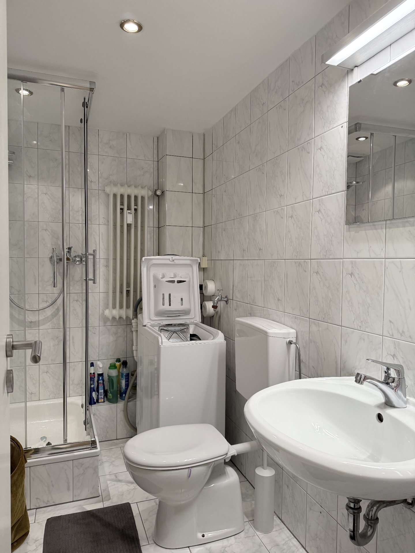 * hell gefliestes Badezimmer mit Dusche und Duschabtrennung