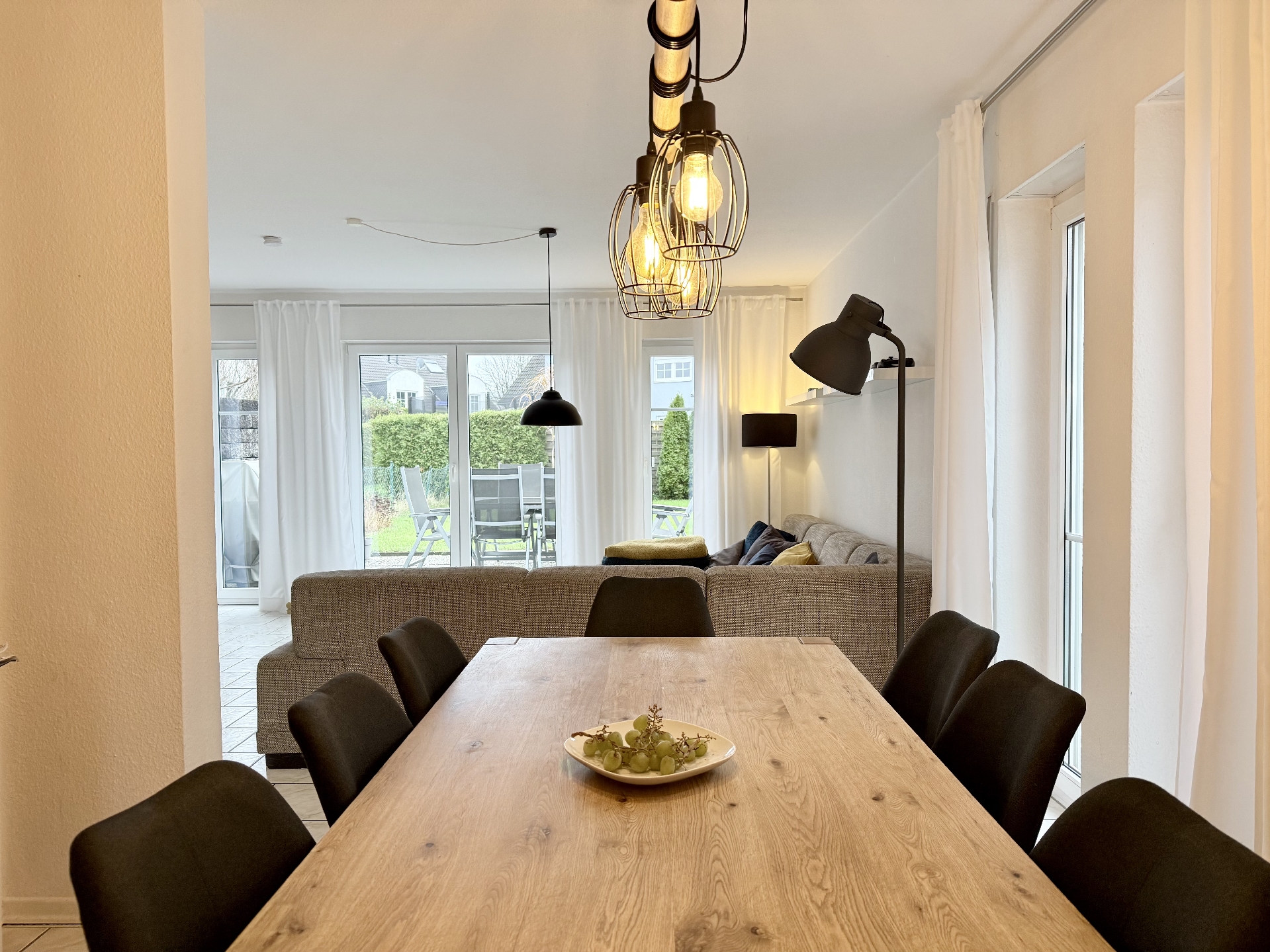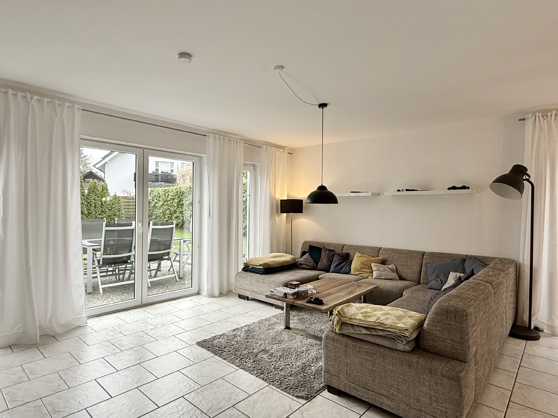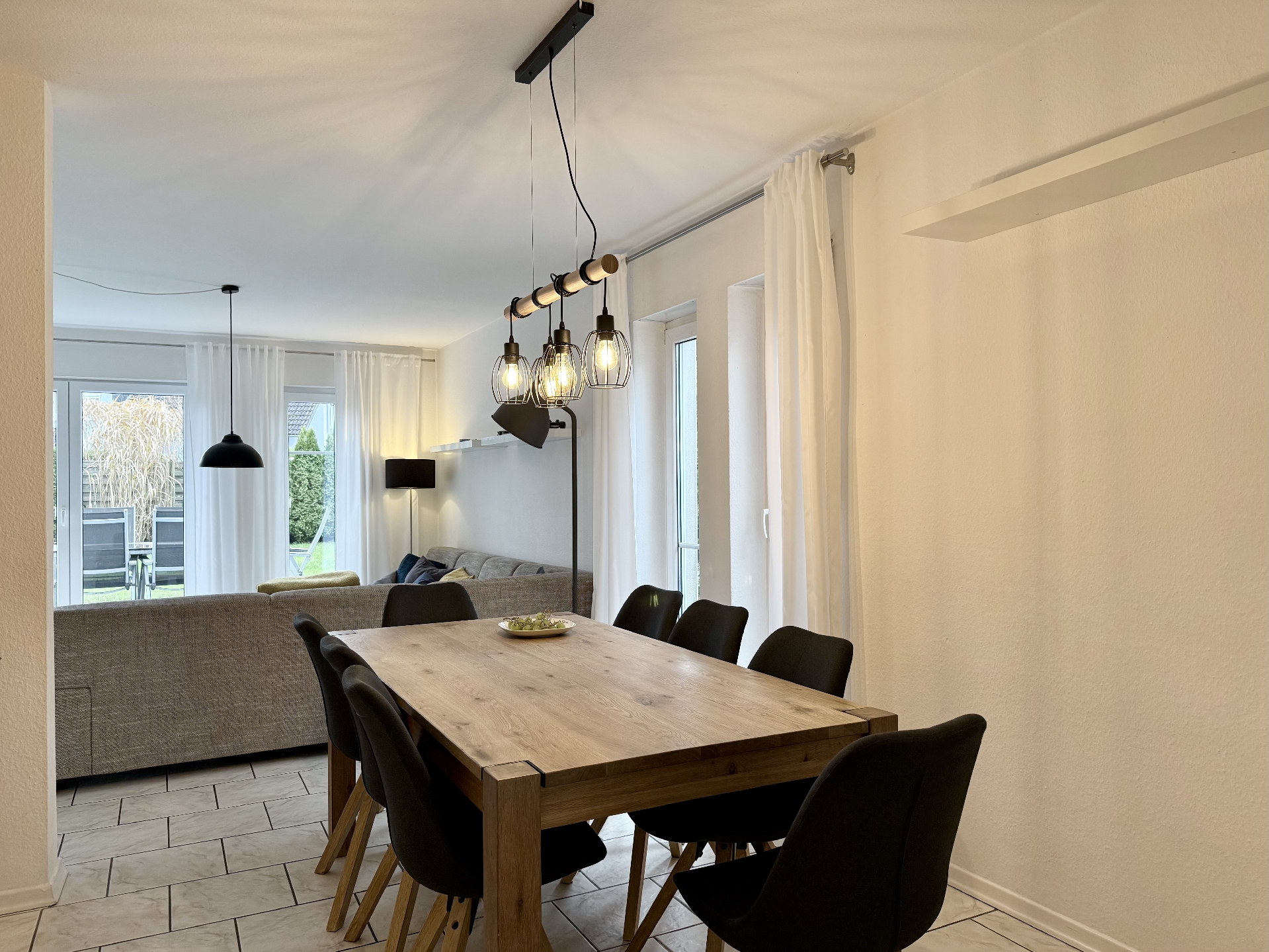 Im Erdgeschoss empfängt Sie eine einladende, weitläufige Diele, von der alle Räume bequem erreichbar sind. Hier befinden sich das stilvolle Gäste-WC mit Tageslicht, die separate Küche sowie der helle Wohn- und Essbereich. Große Fensterflächen schenken dem Wohnraum ein freundliches, lichtdurchflutetes Ambiente. Die angrenzende Terrasse sowie der gepflegte, sonnenverwöhnte Garten erweitern den Wohnraum ideal nach draußen und laden zu erholsamen Stunden ein.
