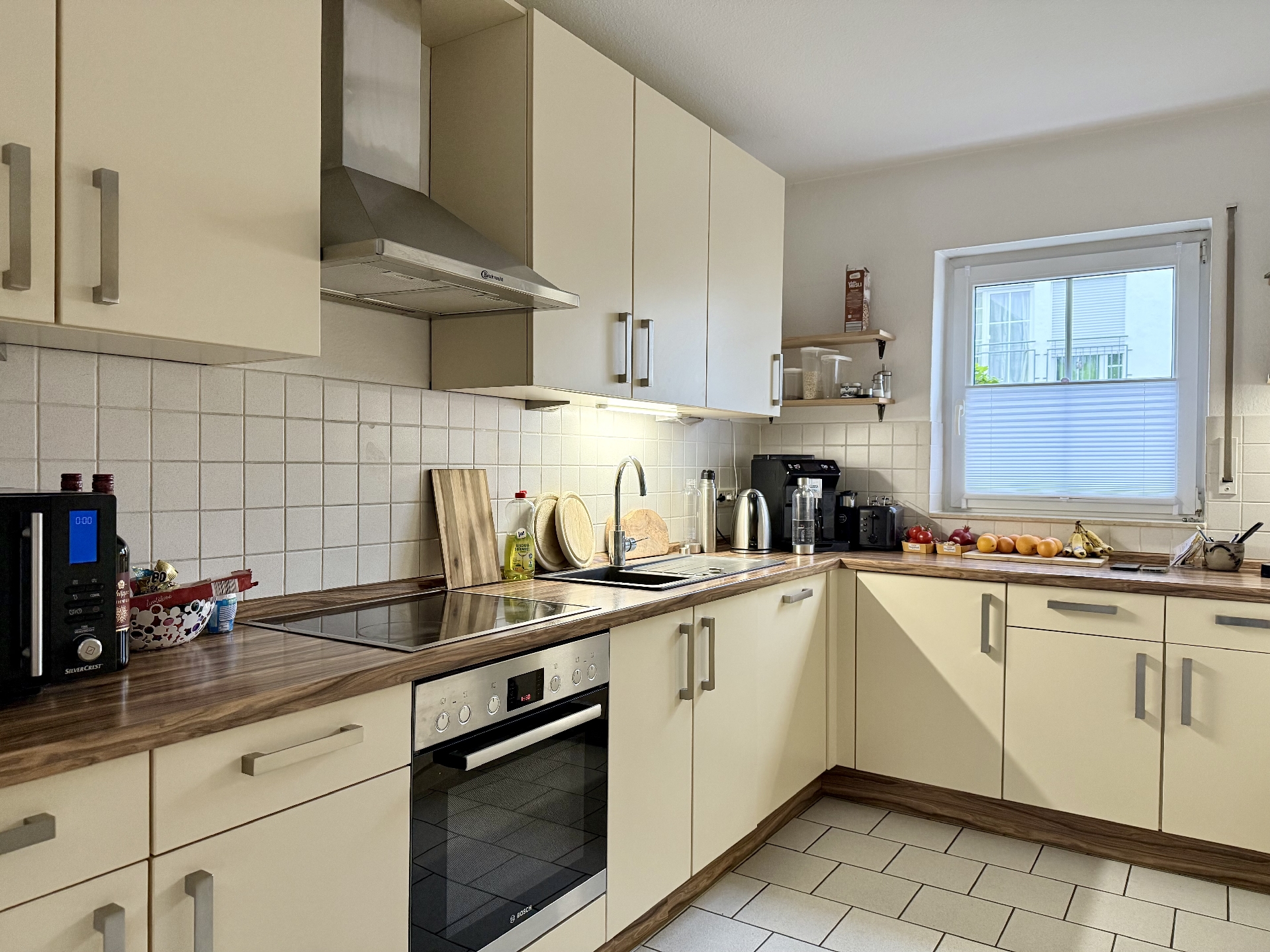 Die Küche bietet ausreichend Platz und verfügt über einen praktisch integrierten Essbereich. Die hochwertige, moderne Einbauküche inklusive Elektrogeräten kann auf Wunsch gern von den aktuellen Mietern übernommen werden.
