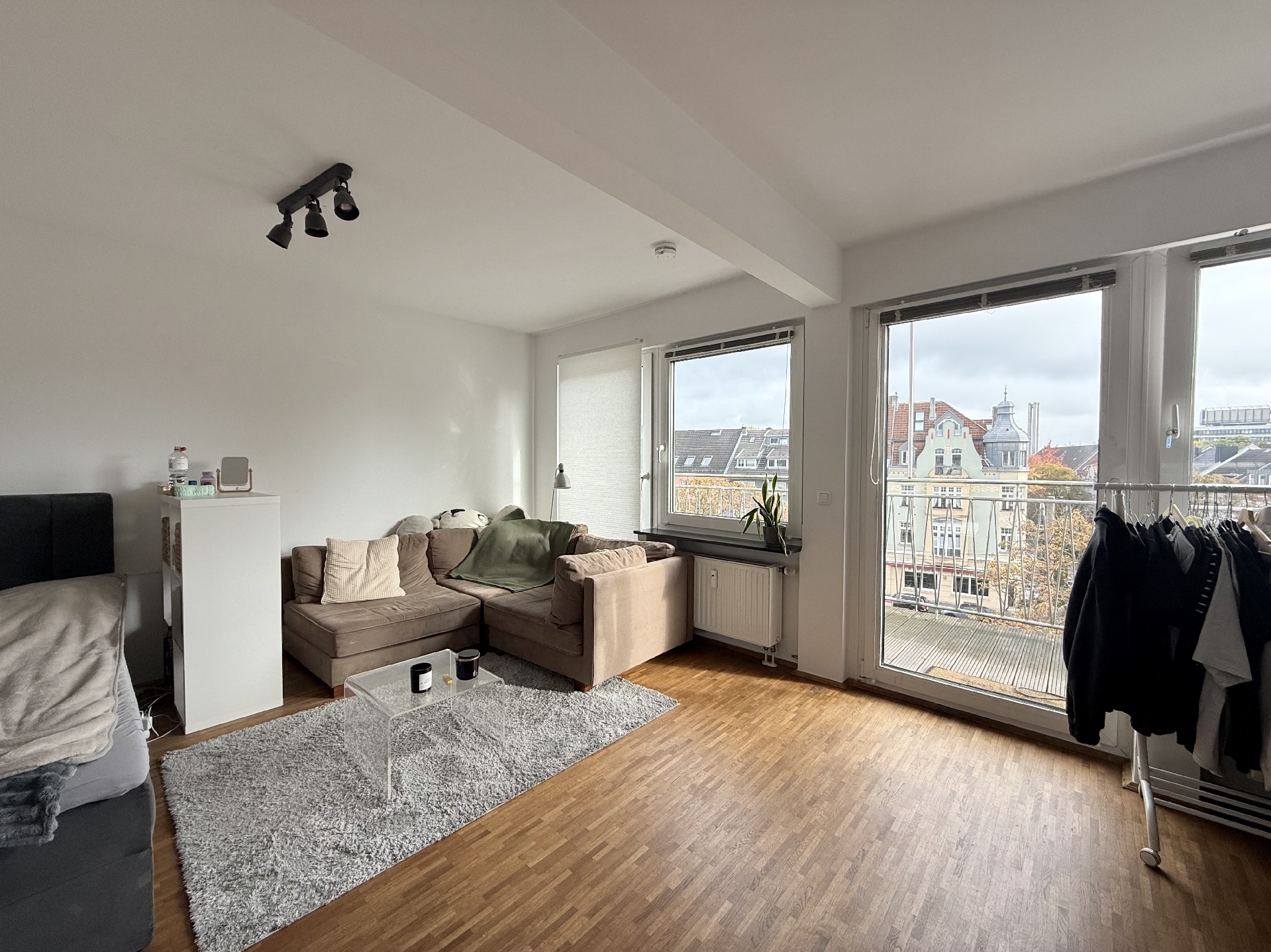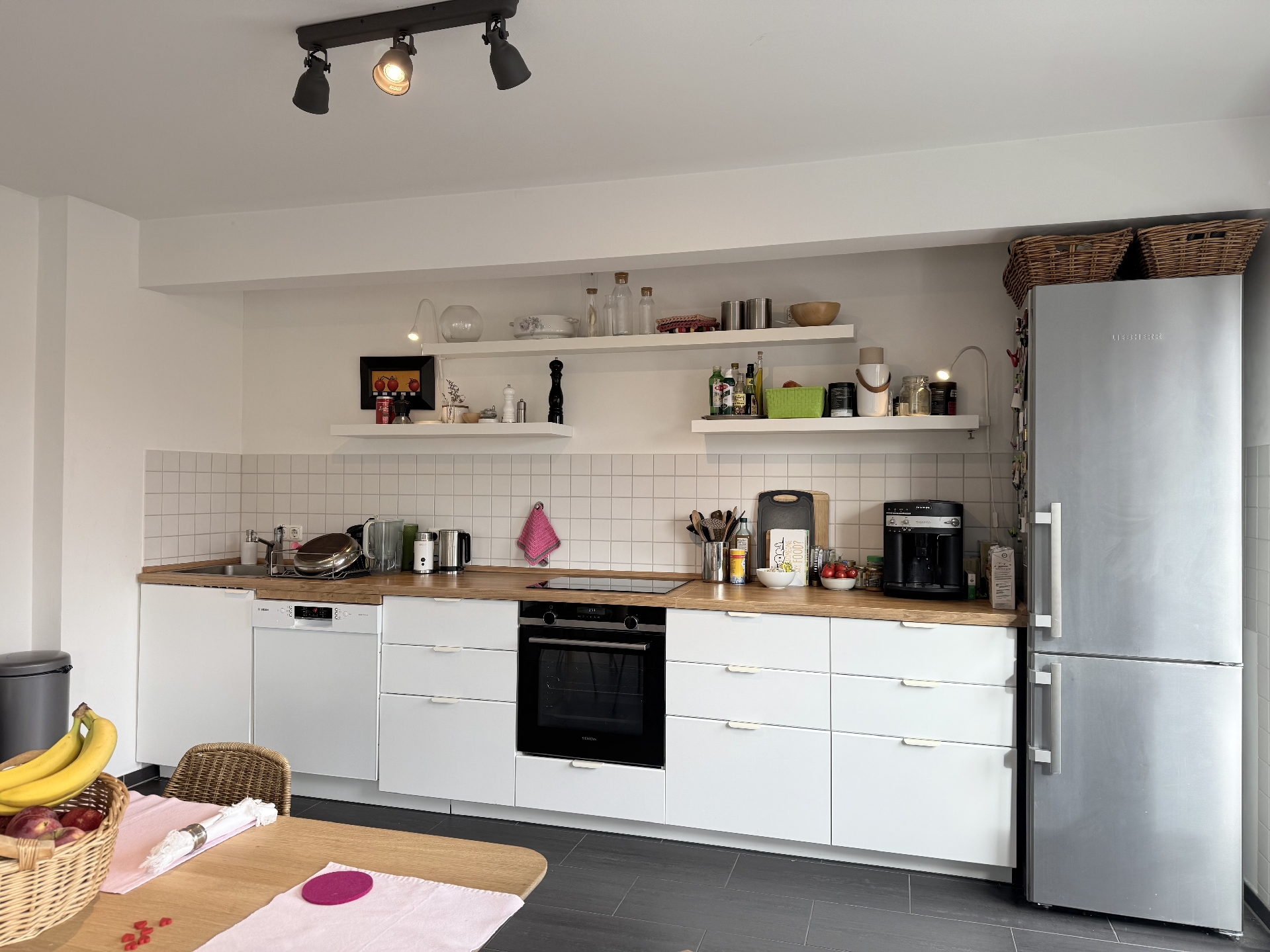 Der offen gestaltete Wohn- und Essbereich mit angrenzender Küche präsentiert sich großzügig und einladend. Große Fensterflächen sorgen für viel Tageslicht und schaffen eine angenehme Wohnatmosphäre. Die vorhandene Küchenzeile kann bei Interesse von den aktuellen Mietern übernommen werden. Der flexible Grundriss bietet vielfältige Möblierungsmöglichkeiten und ausreichend Platz für einen gemütlichen Wohnbereich sowie einen großzügigen Esstisch.