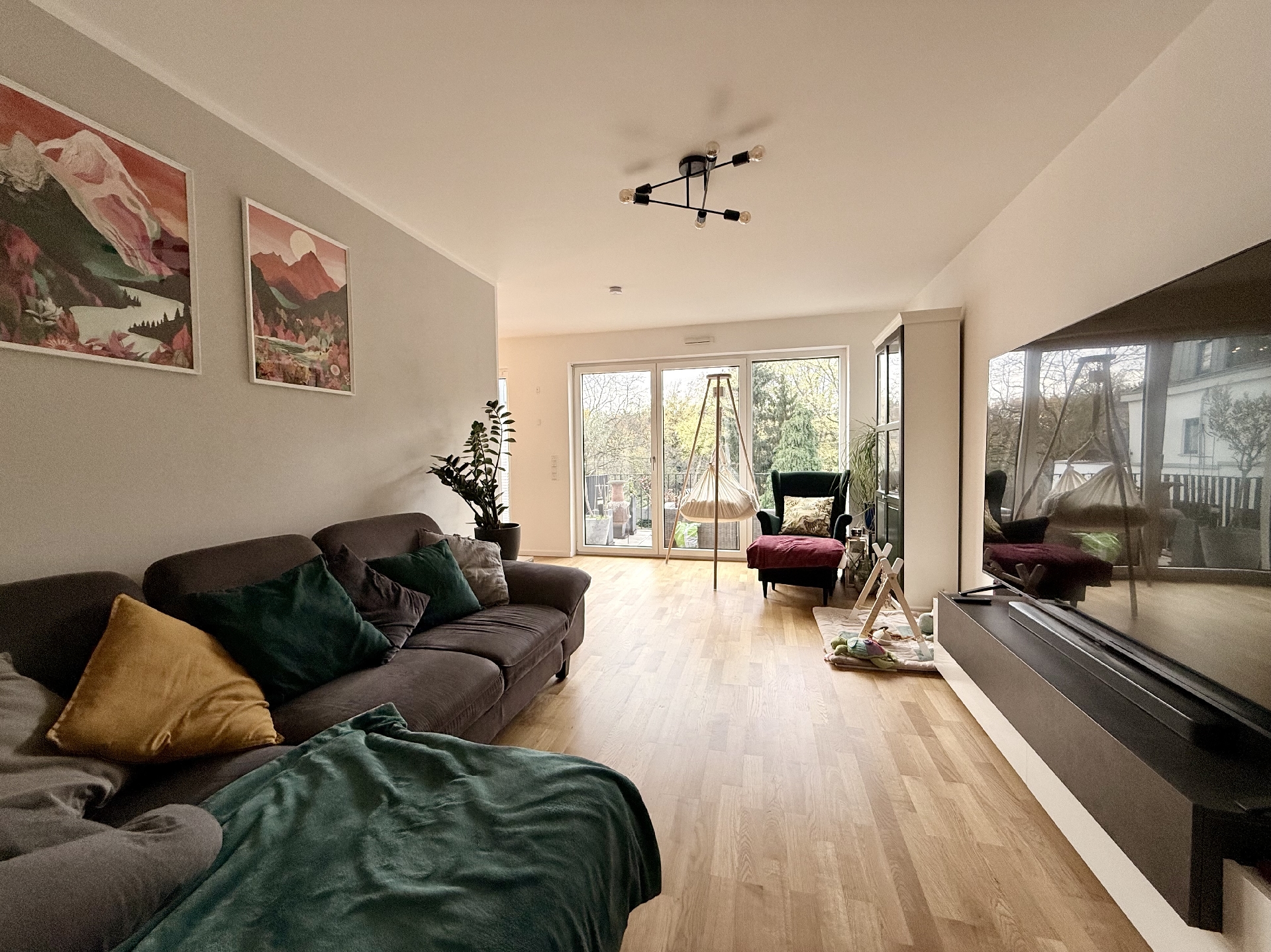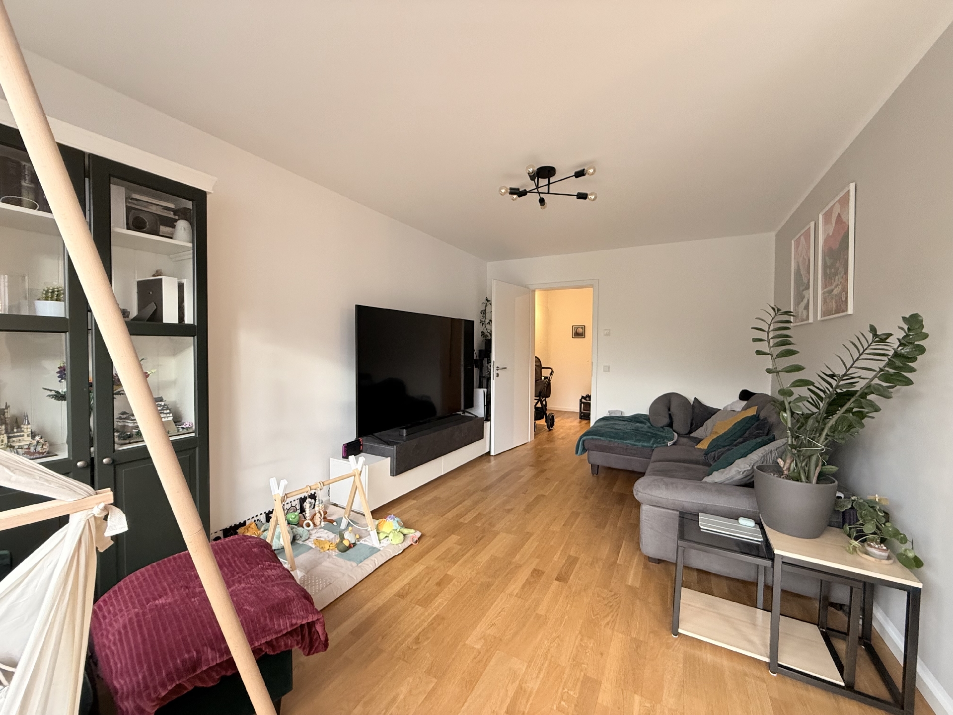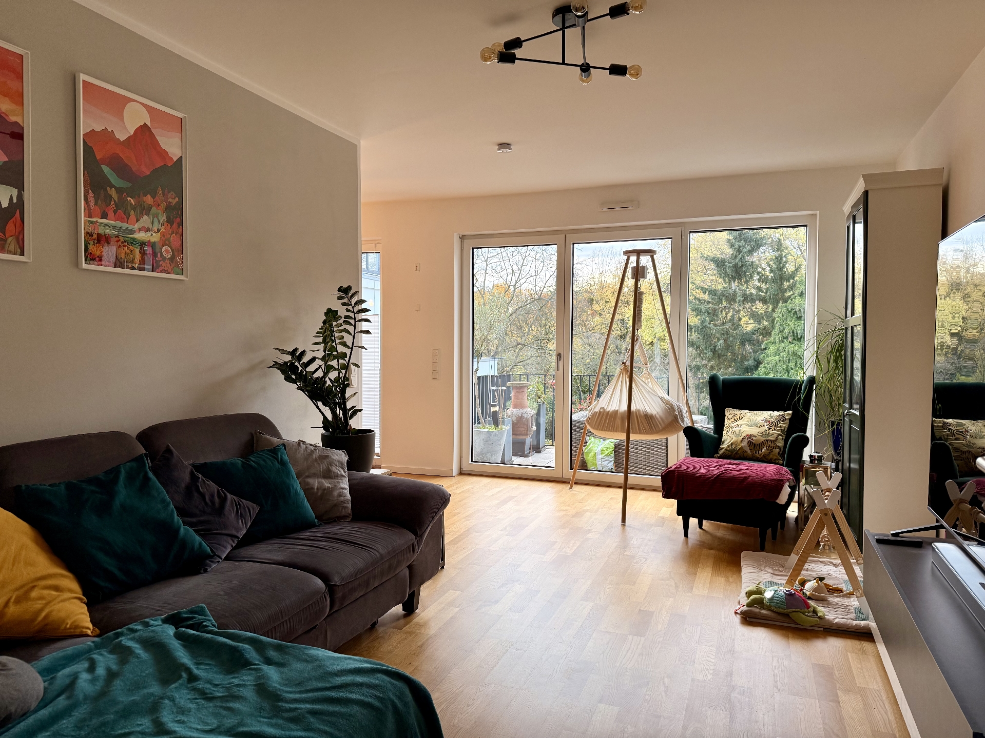 Das Wohnzimmer überzeugt durch seine gemütliche Atmosphäre und viel Tageslicht dank raumhoher Fenster. Der angrenzende Balkon lädt zum Entspannen in der Sonne ein.