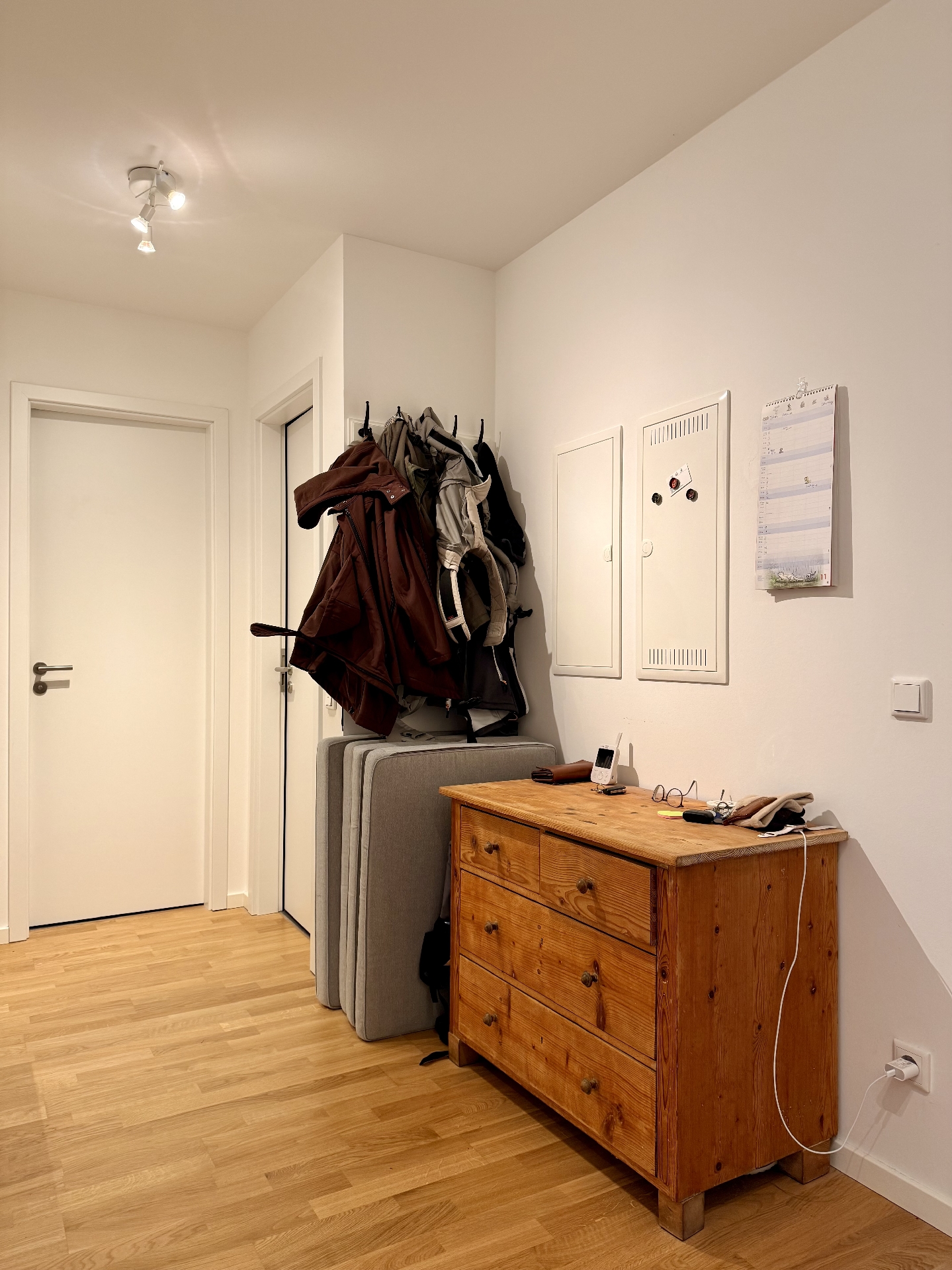 Über die Diele sind alle Räume bequem zugänglich. Im Eingangsbereich ist ausreichend Platz für eine Garderobe, und der praktische Abstellraum sorgt für zusätzlichen Stauraum.