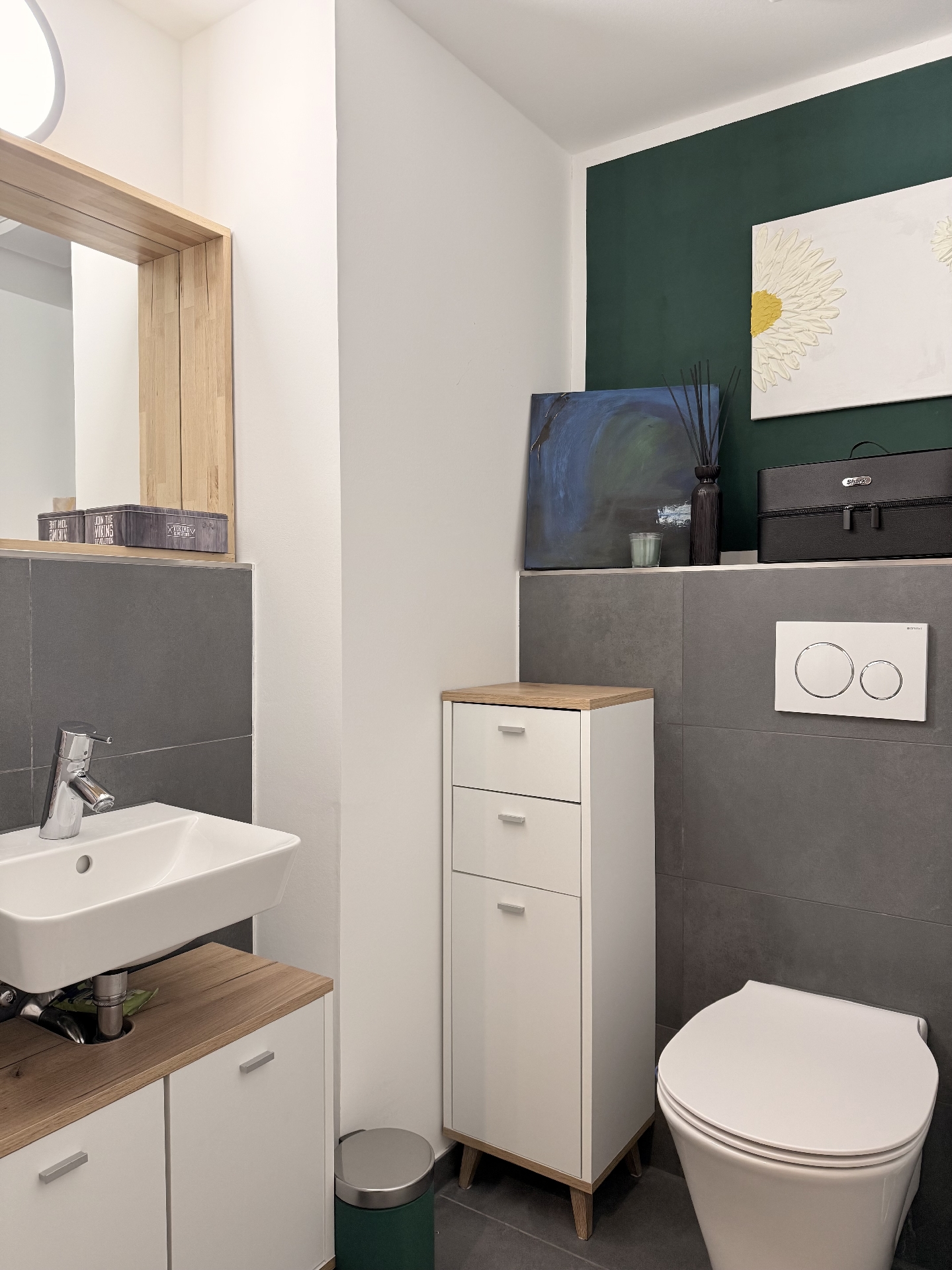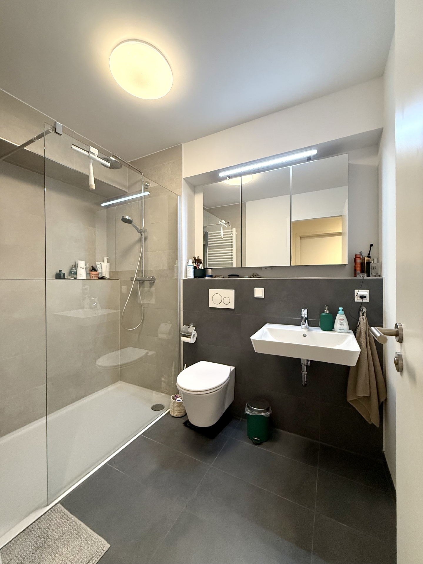 Eine große, begehbare bodentiefe Dusche finden Sie im modernen Badezimmer vor. Ein separates Gäste-WC ist ebenfalls vorhanden.